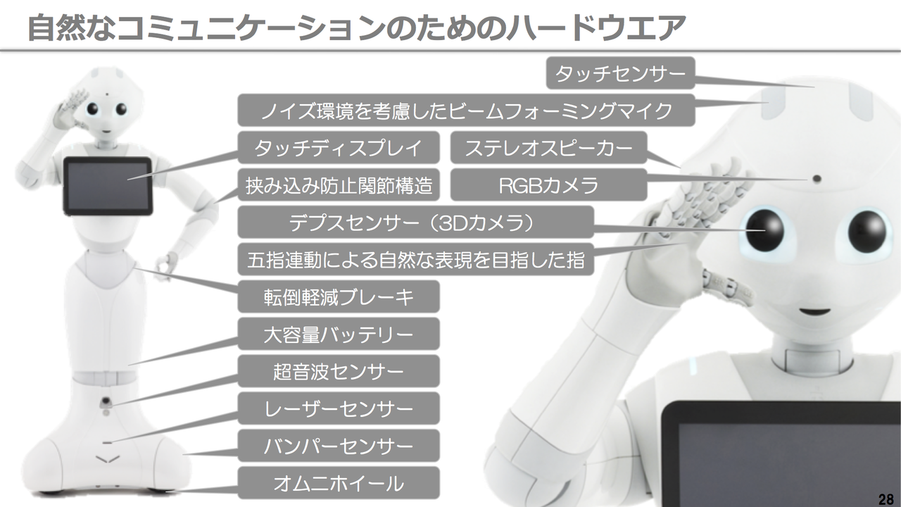 Pepperは、感情を理解してユーザを喜ばせることができるロボットを目指しています。Pepperが人間とのコミュニケーションの中で感情を機械学習するには、大量の情報が必要になります。一人ひとりの情報では十分なデータ量にならないので、クラウド人工知能への情報インプットを実現するためには、大規模展開が必須となります。 一方、ほとんどのユーザはロボットとのコミュニケーション経験がないので、普及を図るために 198,000円という相当無理した価格設定をしたそうです。②自然なコミュニケーションのためのUI