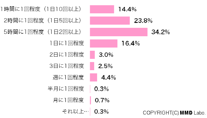 調査結果によると、「5時間に1回程度(1日2回以上)」が34.2%と最も多く、次いで「2時間に1回程度(1日5回以上)」が23.8%、 「1日に1回程度」が16.4%。合わせて88.8%の主婦が「1日に1回以上」ログインしていることが分かった。 ちなみに「1時間に1回程度(1日10回以上)」と回答した主婦は14.4%もいた。