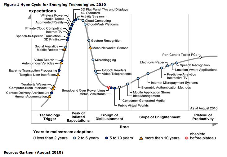 米調査会社Gartnerが1800種類ものテクノロジーのハイプサイクルを発表している。ハイプとは、過度に期待が高まっている状態のこと。ブームやバブルのことを指す。2、3年前に産業界がこぞって三次元空間セカンドライフに参入したのはハイプだった。多くの技術は、登場してから期待を集め、過度に期待が高まればバブルが弾け、その後ゆっくりと完成の域に達して普及していく。この一連の過程を、ハイプサイクルと呼ぶわけだ。