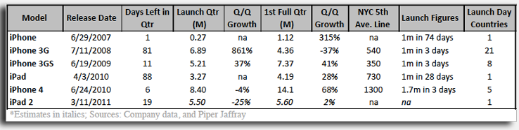 同氏がまとめた統計によると、iPadは昨年4月3日に発売され、発売日を含む四半期(4−6月期)の販売台数は327万台だった。発売日から四半期の最終日までの88日間での販売台数なので、単純計算すると1日当たり3.7万台売れたことになる。