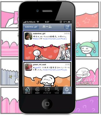 今回のバージョンアップで僕が一番注目しているのは、自動的にイラストを投稿できる「オートイラスト配信システム」と呼ばれる仕組み。将来的には自分が書いた自分の似顔絵が自分のつぶやきに表示されるようになるかも。僕は横井さんと友達ということもあって、僕の似顔絵が実は既に配信されている。僕のつぶやきを探してiPhoneをシェイクしてみてください。僕の似顔絵に変わるから。