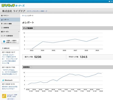 ライブドアは、同社の位置情報系アプリ「ロケタッチ」を利用した来店促進ツール「ロケタッチオーナーズ」を店舗向けに正式リリースした。店舗側はこのツールを使うことで、ロケタッチ上に表示される自分の店舗ページを編集できるほか、来店促進のためのクーポンを発行できる。常連ユーザーのランキングや競合店の状況、タッチがあったことを知らせてくれるアラート機能、タッチ数のアクセス解析などの機能を無料で利用できるようになるという。発表文によると「ロケタッチオーナーズ」の主な機能は次の通り。