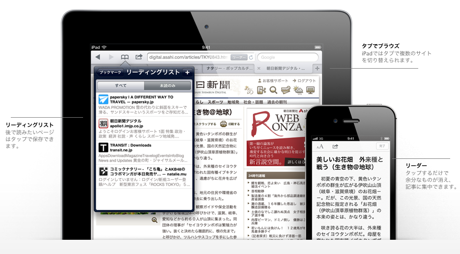 Safariのリーダーで「広告や不要なものが表示されないので、ウェブの記事だけに集中できます」。これはどんな感じか試してみたい。またあとでじっくり読むために記事をiCloud上に保存する「リーディングリスト」という機能も追加されるという。iPadで読みかけの記事をiPhoneで読む、ということもできそう。