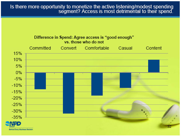 NPD GroupとNARMが発表した問題の調査結果の一部はDigital Music Newsが報じている。インターネット環境が楽曲購入にどのような影響を与えているかという調査結果が下のグラフ。音楽のファン層を、音楽が大好きな層(Committed)からそれほど好きでもない層(Content)まで5段階に分け、インターネットへのアクセスが十分な環境がある際に、楽曲購入が増えたか減ったかをたずねたもの。