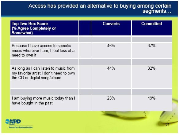 その理由について「音楽大好き(Committed)」の32%と「音楽まあまあ好き(Convert)」の44%が「いつでも好きな曲を聞けるので、楽曲を購入する必要を感じない」と答えているという。