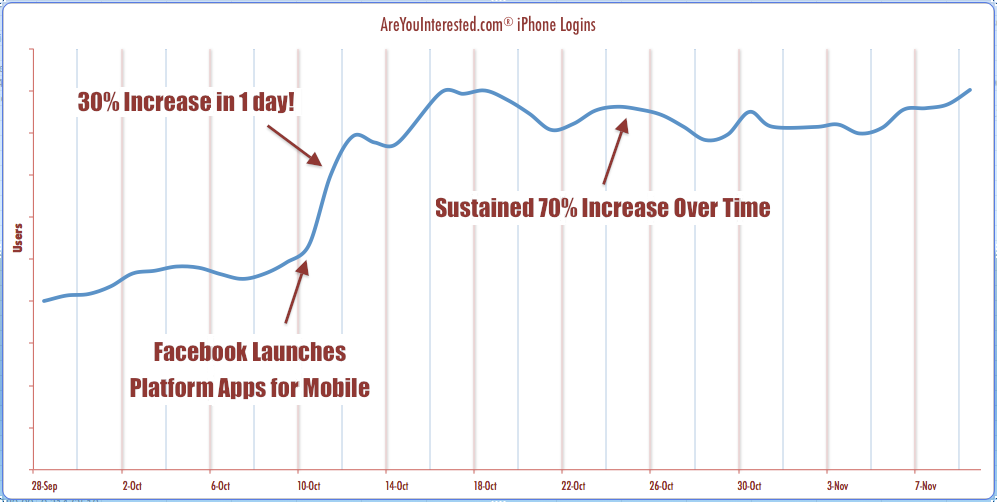 それによるとFacebookのモバイルプラットフォームのリリース直後からログイン数が急増、その後も高いログイン数を維持したままだという。
