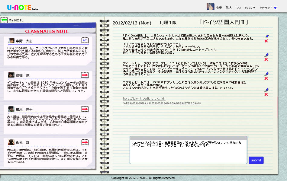 僕が見せてもらったのはウェブ版で、FacebookのIDを使ってログインすると同じ授業を受けている人とリアルタイムでノートをシェアできる、というサービス。具体的には、200字ぐらいでメモをとったものが、このサービス上の友人のタイムラインに次々と表示され、自分のメモよりもいいものがあればコピーして自分のノートにペーストできる、というシンプルなもの。でもこのシンプルさがとてもいいと思う。